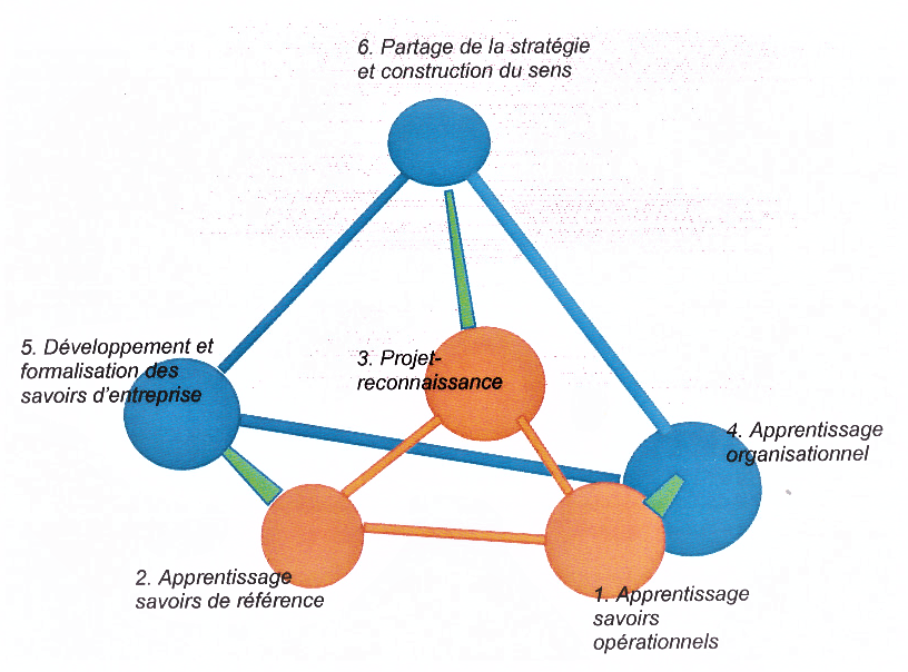 Les pôles acquisition des savoirs opérationnels (1) et apprentissage organisationnel (4) sont étroitement liés par le fait même qu’ils ont en commun un point d’ancrage unique, à tel point que la séparation entre l’acquisition savoirs opérationnels individuels et collectifs peut apparaitre artificielle.